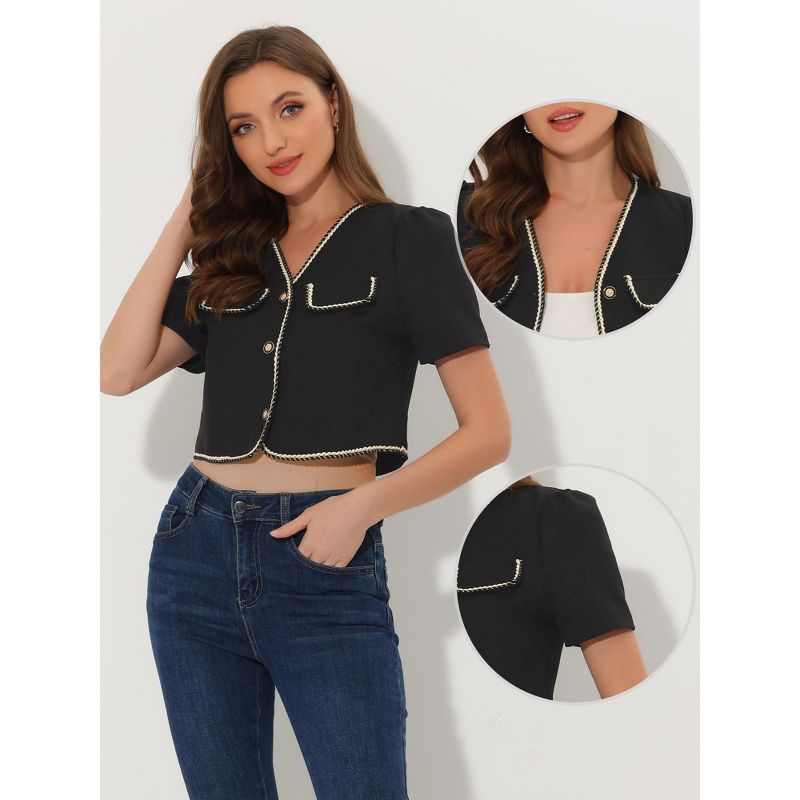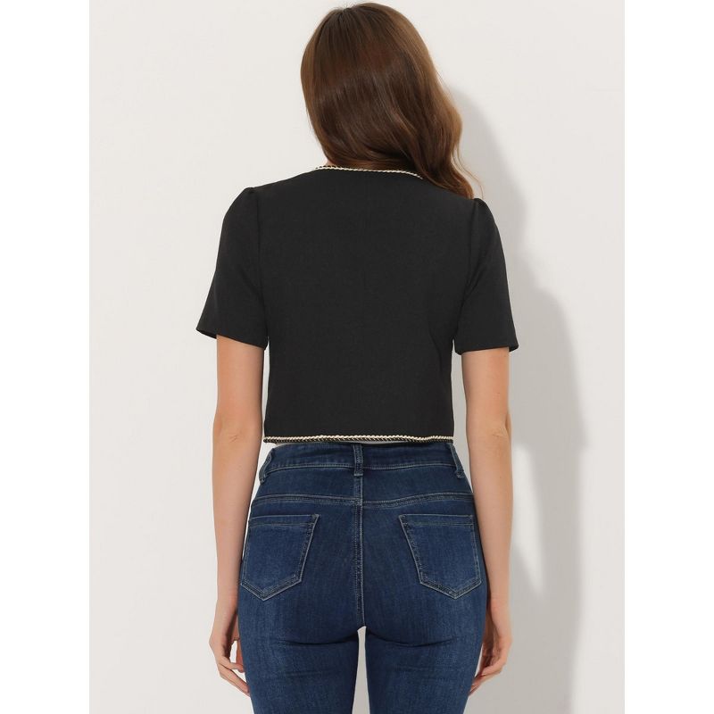 Allegra K Women's Collarless Contrast Trim Short Sleeve Tweed Blazer Black Medium