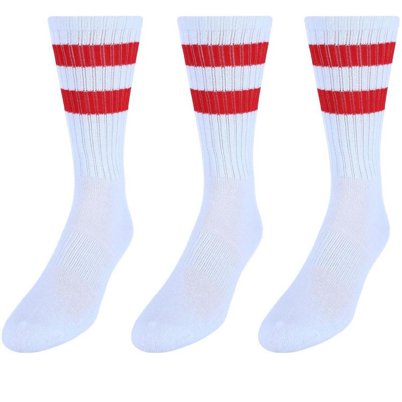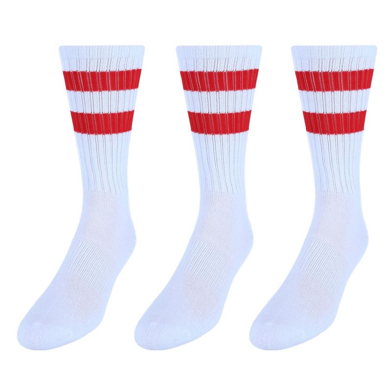 CTM Men's Crew Striped Socks (3 Pairs), White with Red Stripes